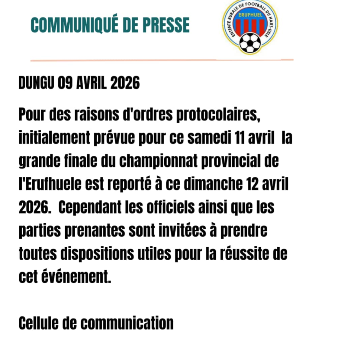 La grande finale du championnat provincial de l’ERUTHUELE, initialement prévue samedi 11 avril 2026, a été reportée à dimanche 12 avril 2026 pour des raisons d’ordre protocolaire, a appris le climattropical.cd, par la cellule de communication